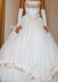Продается свадебное платье в отличном состоянии, цвет кремовый, корсет регулируется шнуровкой, расшит бисером, очень пышное, подходит на 5 колец. В подарок шубка (накидка к платью).